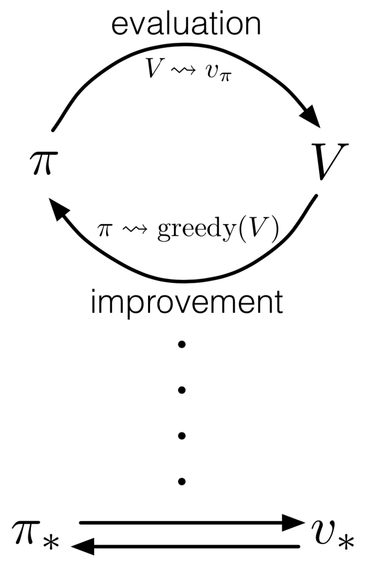 \[ \pi_0 \overset{\text{E}}{\longrightarrow} v_{\pi_0} \overset{\text{I}}{\longrightarrow} \pi_1 \overset{\text{E}}{\longrightarrow} v_{\pi_1}\overset{\text{I}}{\longrightarrow} \cdots \overset{\text{I}}{\longrightarrow} \pi_\ast \overset{\text{E}}{\longrightarrow} v_\ast \]