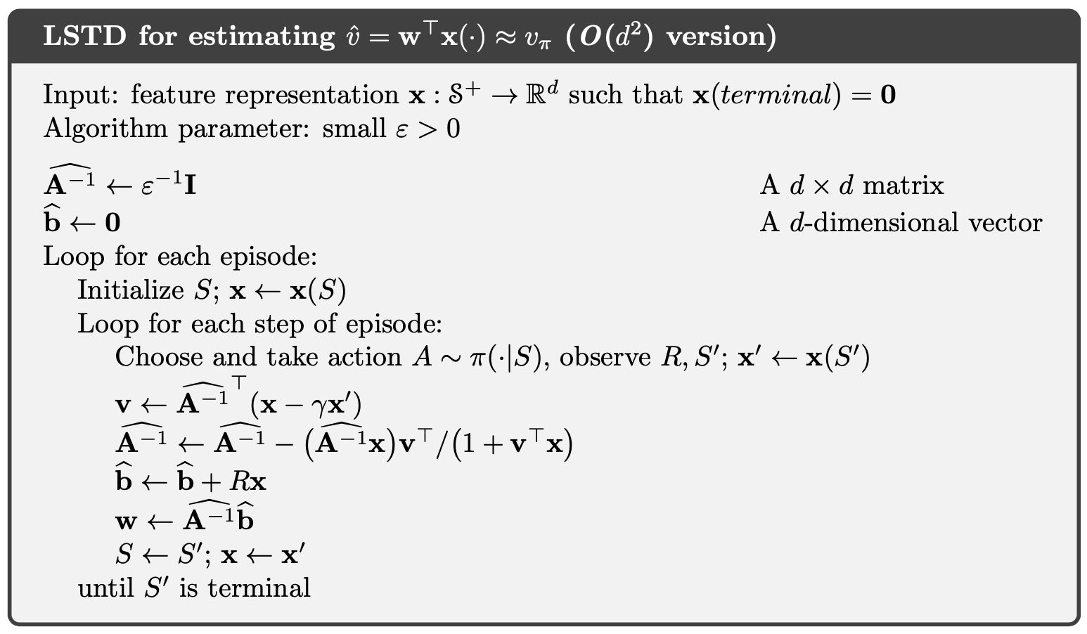 \[ \begin{gather} \hat{\mathbf{A}}_t = \sum_{k=0}^{t-1} \mathbf{x}_k (\mathbf{x}_k-\gamma \mathbf{x}_{k+1})^T + \varepsilon \mathbf{I} \qquad \hat{\mathbf{b}}_t = \sum_{k=0}^{t-1} R_{t+1} \mathbf{x}_k \\ \mathbf{w}_t = \hat{\mathbf{A}}_t^{-1} \hat{\mathbf{b}}_t \end{gather} \]