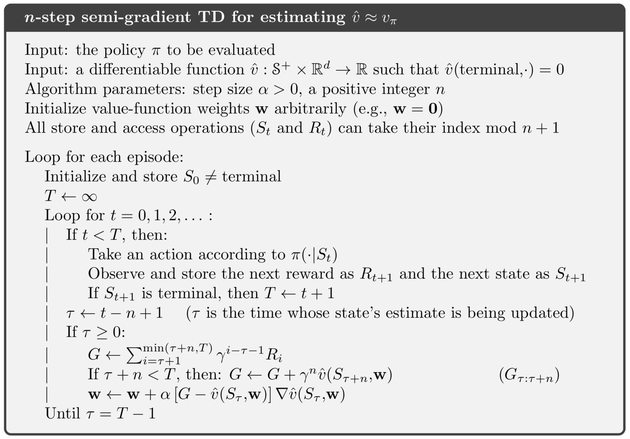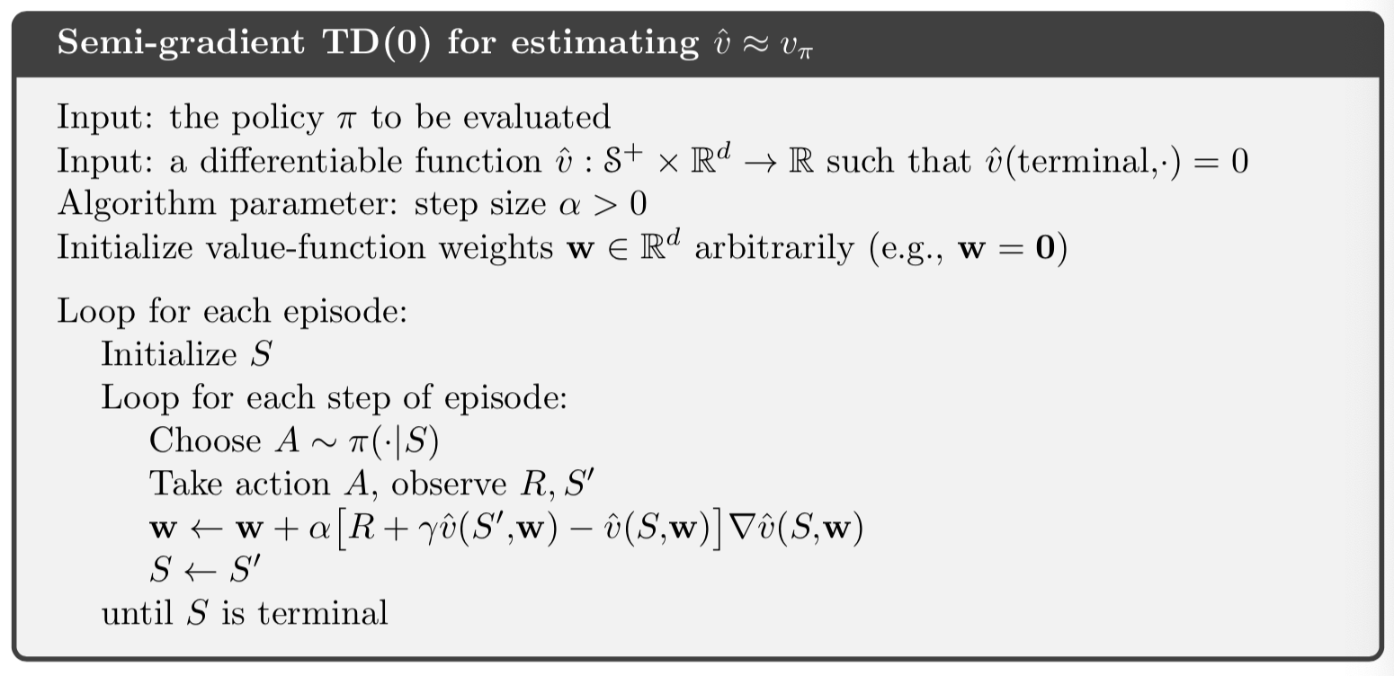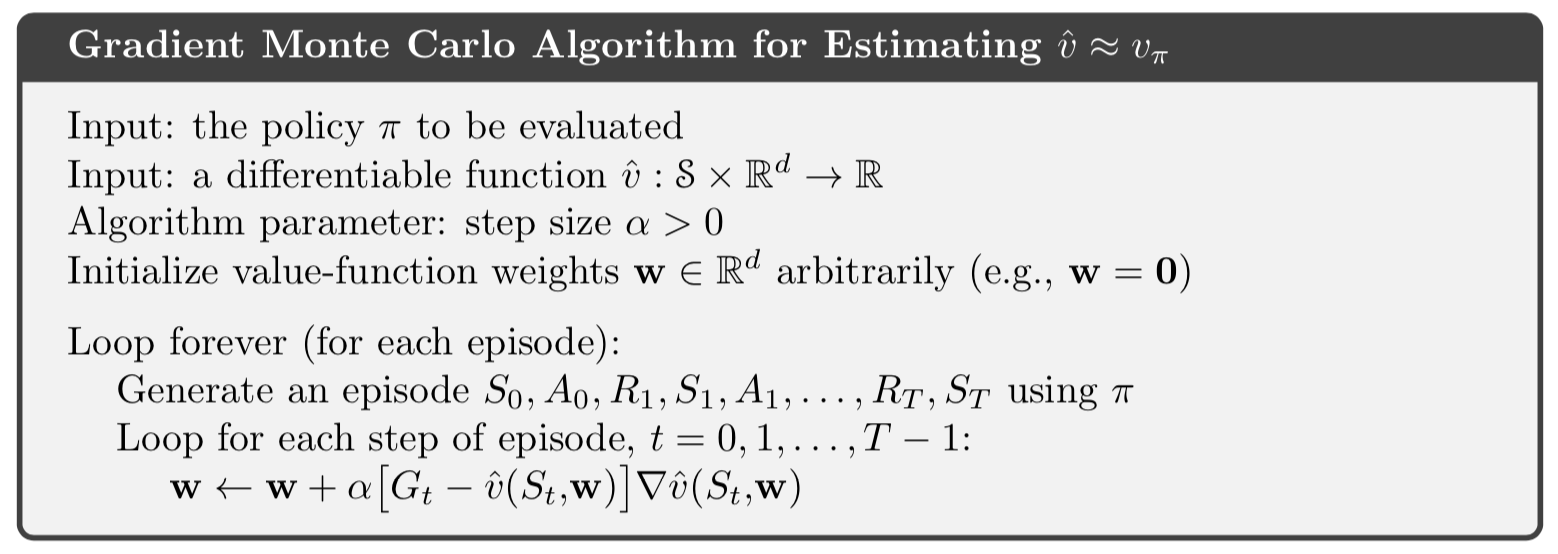 \[ \mathbf{w}_{t+1} = \mathbf{w}_t + \alpha\left[ U_t - \hat{v}(S_t,\mathbf{w}_t)\right] \nabla \hat{v}(S_t,\mathbf{w}_t) \]